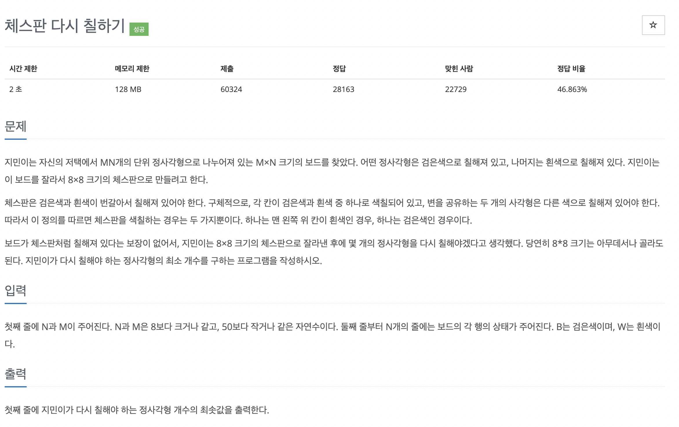 첫째 줄에 N과 M이 주어진다. N과 M은 8보다 크거나 같고, 50보다 작거나 같은 자연수이다. 둘째 줄부터 N개의 줄에는 보드의 각 행의 상태가 주어진다. B는 검은색이며, W는 흰색이다.