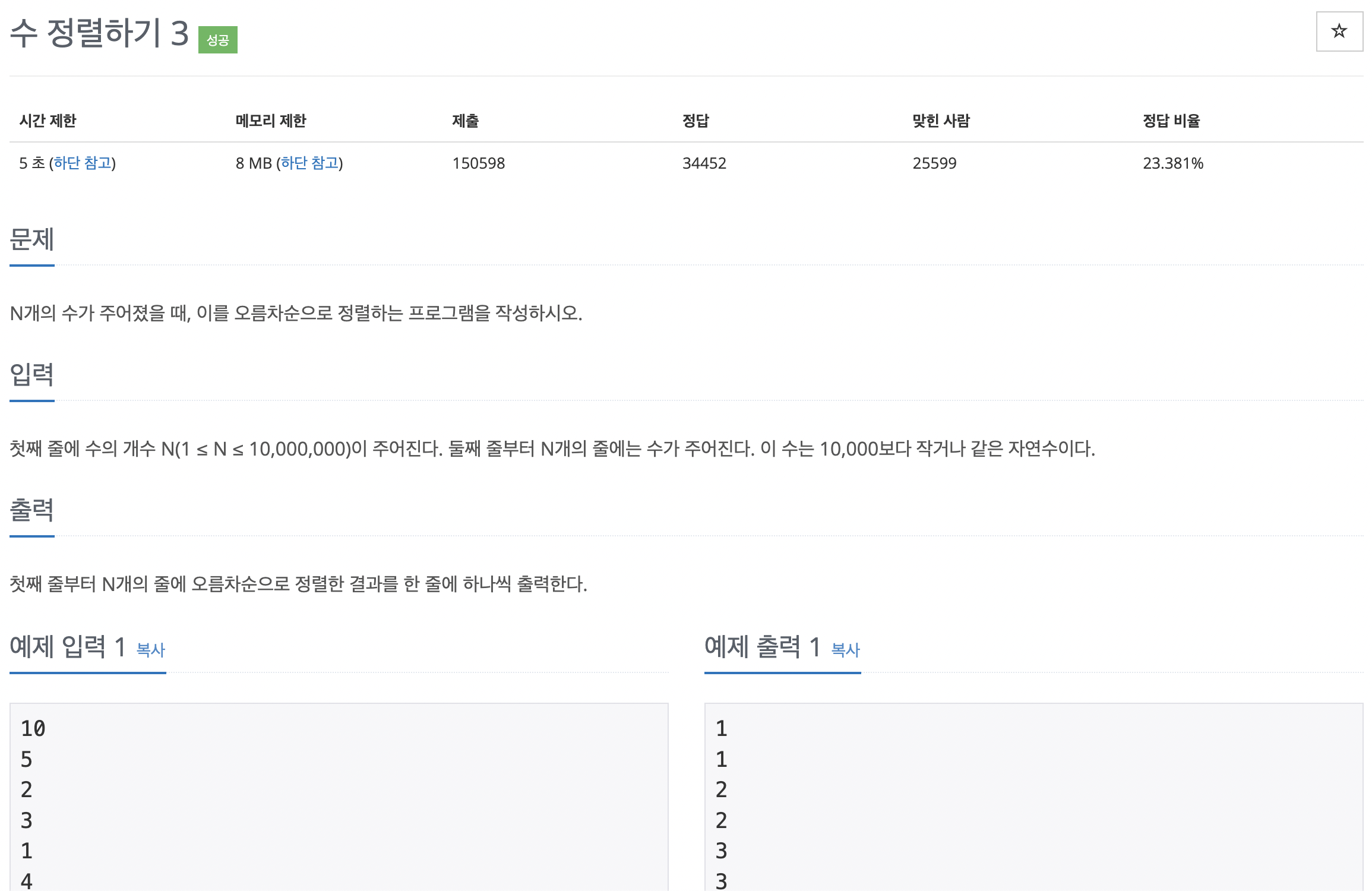 첫째 줄에 수의 개수 N(1 ≤ N ≤ 10,000,000)이 주어진다. 둘째 줄부터 N개의 줄에는 수가 주어진다. 이 수는 10,000보다 작거나 같은 자연수이다.