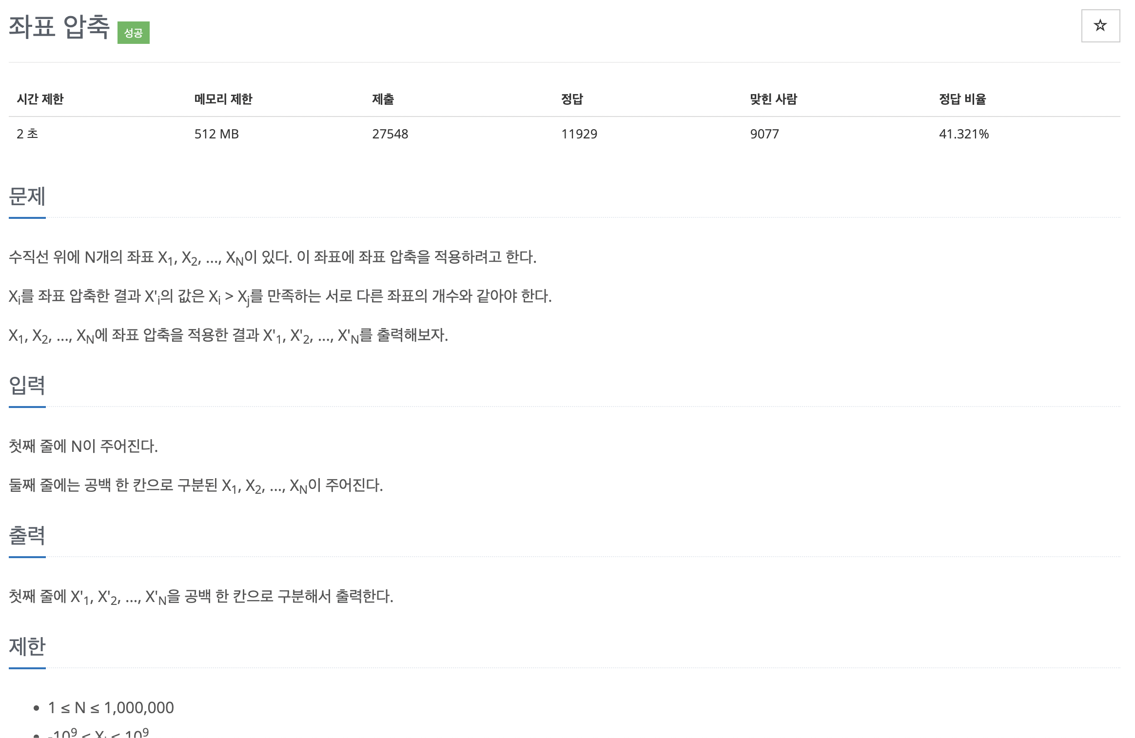 https://www.acmicpc.net/problem/18870 Xj를 만족하는 서로 다른 좌표의 개수와 같아야 한다. X1, X2, ..., XN에 좌" data-og-host="www.acmicpc.net" data-og-source-url="https://www.acmicpc.net/problem/1887..