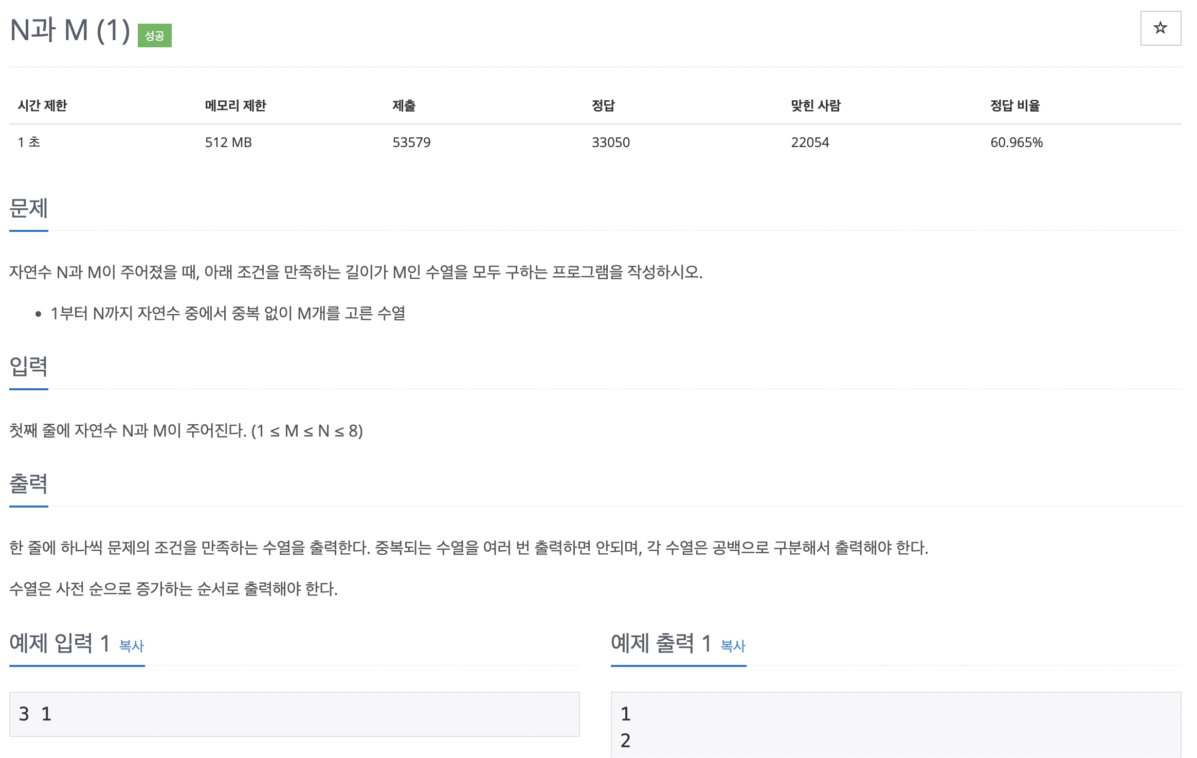 www.acmicpc.net/problem/15649 15649번: N과 M (1) 한 줄에 하나씩 문제의 조건을 만족하는 수열을 출력한다. 중복되는 수열을 여러 번 출력하면 안되며, 각 수열은 공백으로 구분해서 출력해야 한다. 수열