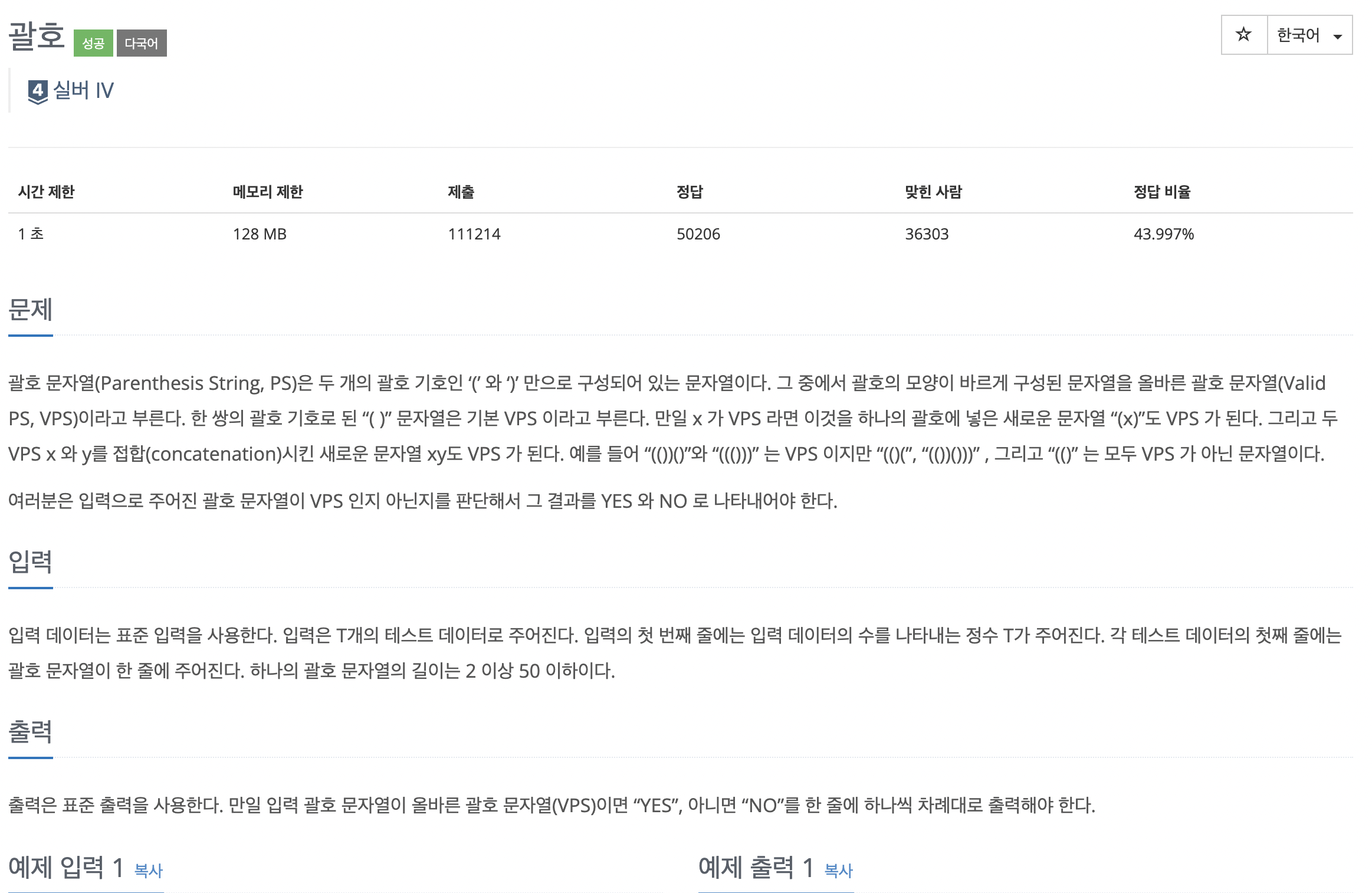 괄호 문자열(Parenthesis String, PS)은 두 개의 괄호 기호인 ‘(’ 와 ‘)’ 만으로 구성되어 있는 문자열이다. 그 중에서 괄호의 모양이 바르게 구성된 문자열을 올바른 괄호 문자열(Valid PS, VPS)이라고