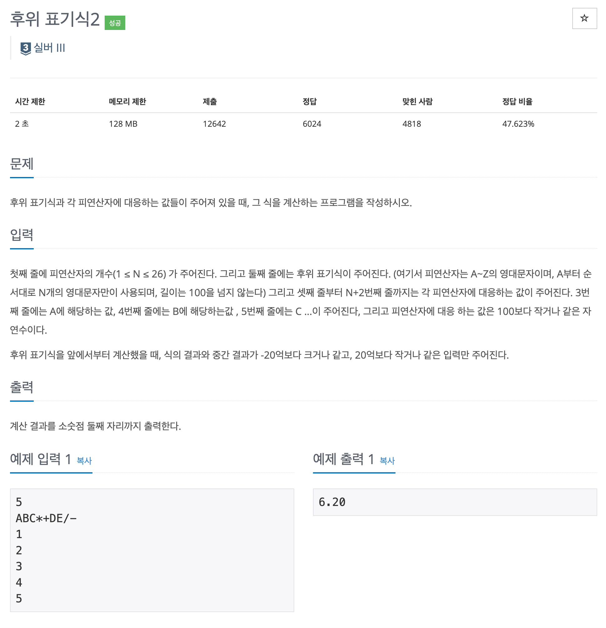 첫째 줄에 피연산자의 개수(1 ≤ N ≤ 26) 가 주어진다. 그리고 둘째 줄에는 후위 표기식이 주어진다. (여기서 피연산자는 A~Z의 영대문자이며, A부터 순서대로 N개의 영대문자만이 사용되며, 길이