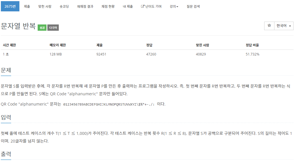 문자열 S를 입력받은 후에, 각 문자를 R번 반복해 새 문자열 P를 만든 후 출력하는 프로그램을 작성하시오. 즉, 첫 번째 문자를 R번 반복하고, 두 번째 문자를 R번 반복하는 식으로 P를 만들면 된다