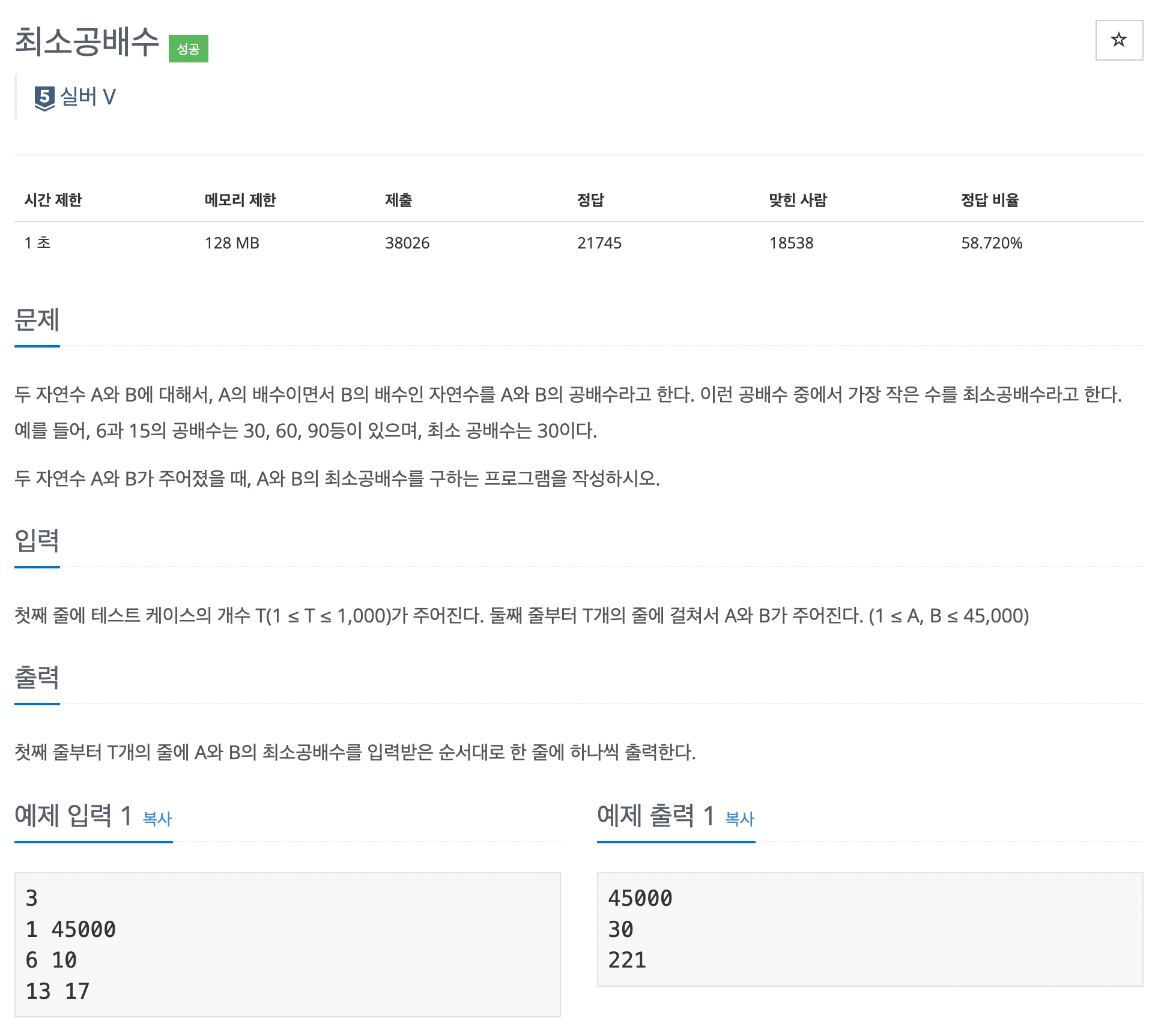 두 자연수 A와 B에 대해서, A의 배수이면서 B의 배수인 자연수를 A와 B의 공배수라고 한다. 이런 공배수 중에서 가장 작은 수를 최소공배수라고 한다. 예를 들어, 6과 15의 공배수는 30, 60, 90등이 있